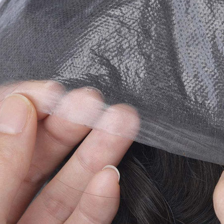 The thinner 0.03mm skin material at the hairline, paired with invisible v-loop knots, achieves an authentic-looking hairline.